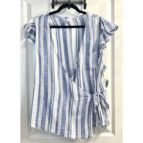 Old Navy Linen Blend Wrap Blouse Size XXL 2XL Nautical Striped Flutter Sleeves