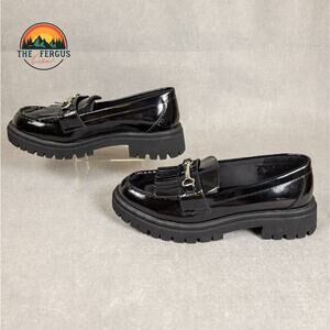 The Old Navy Black Faux Leather Loafers for women's size 8.5 feature a chunky lug sole and a decorative metal buckle accent. These slip-on loafers have a patent finish and a fringe or kiltie detail over the toe. They are a trendy choice for a casual or dressy look.