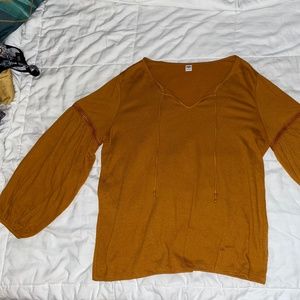 Burnt orange blouse with flowy long sleeves, strings, and detailing.