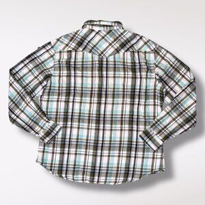 Soft and breathable western-style shirt in a green, blue, and white plaid with pearly snap buttons and chest pockets. Great for layering or wearing solo.