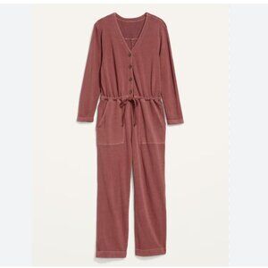 Old Navy Long-Sleeve Cropped French-Terry Utility Jumpsuit - casual, soft, stretchy, comfortable. Has pockets, button front, long sleeve, cropped length.
