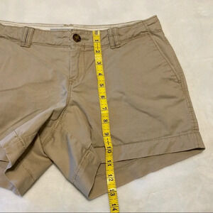 Old Navy low rise khaki shorts in size 6. Zip & button front closure, 2 back & 2 front pockets. Good pre-owned condition, small stain to the left below zipper, please see photos for details. From smoke free and pet free home.