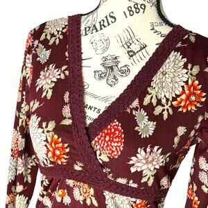 Brighten up your wardrobe with this Old Navy long-sleeve floral top in a rich maroon hue. Featuring a deep V-neckline with delicate lace trim and a flattering empire waist silhouette, this piece blends vintage charm with modern comfort. The dense floral print in warm tones adds a vibrant, eye-catching touch—perfect for fall layering or a soft, romantic vibe any time of year. Dress it up with jeans and boots or keep it casual with leggings and flats.