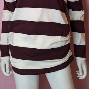 Old Navy Maternity Cream and Maroon Striped Ruched Sides Long Sleeve Tee Medium