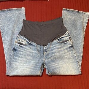 Old Navy maternity jeans, full panel maternity jeans, size 18 maternity pants, flare maternity jeans, blue maternity jeans, comfortable maternity wear, supportive jeans, trendy maternity denim, maternity fashion, casual maternity style