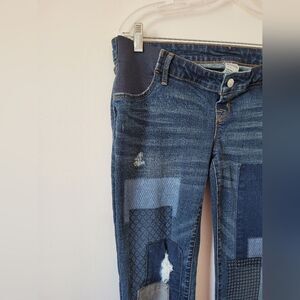 Very cute maternity jeans with a unique patchwork print on front. Lightly distressed. Stretchy side panels. Excellent condition. Size 6 measures approximately 35 inches long 35 waist 28 inseam.