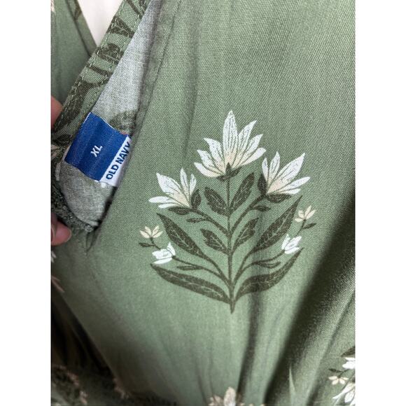 Old Navy green floral maxi dress with tie back. Size XL, stretchy waist. Made in India, cotton blend. Super cute for fall family photos, casual wear, church, or the office. Very good preowned condition with no flaws. Fits cottagecore, forest fairy, boho, peasant. Pockets!
