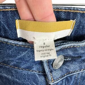 Excellent preowned condition. Medium wash Legacy Straight high rise denim jeans. Have mild factory-distressing. Zipper/button closure. 5-pocket design. Cotton/Lycra material. Approx. measurements: Waist 32", inseam 32", rise 10.5". Size 8.
