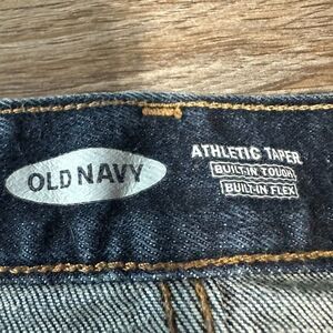 Old Navy mens athletic taper jeans in size 38x30, featuring a comfortable fit through the thigh with a modern tapered leg. Made with Built-In Flex stretch denim for enhanced mobility and all-day comfort. Dark wash finish for a clean, versatile look.