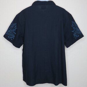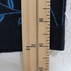 New With Tags! Body: 90% Cotton/10% Linen. Embroidery: 100% Polyester. Handsome Navy Blue Button Down Single Chest Pocket Shirt with Bright Blue Floral Embroidery on Sleeves.