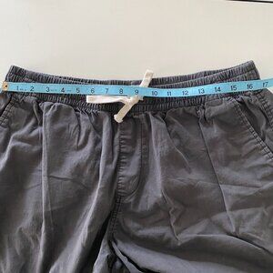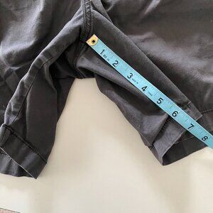 Elastic waist/drawstring shorts with faux fly, front side pockets, one back welt pocket. Inseam = 7", waist is 17" across relaxed.