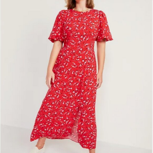 Old Navy Midi Puff Sleeve Dress in Red Floral