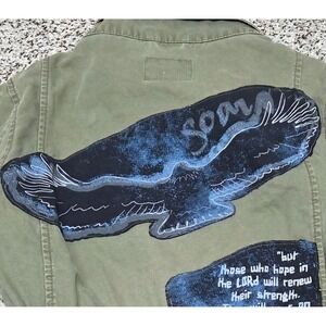 Olive green military jacket from Old Navy, a versatile piece that blends rugged style with everyday comfort. This jacket features a full zip closure, a stand-up collar, and a flattering drawstring waist to cinch your silhouette. The design includes functional front pockets, perfect for carrying essentials, and unique custom artwork on the back. Imagine yourself wearing this jacket on a crisp autumn day, exploring a local farmers market, or adding an edgy touch to a casual weekend outfit.