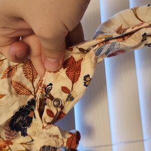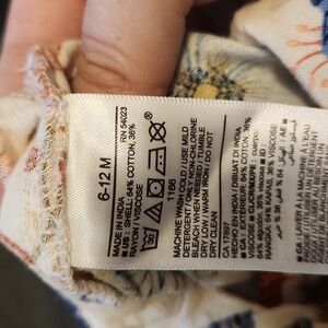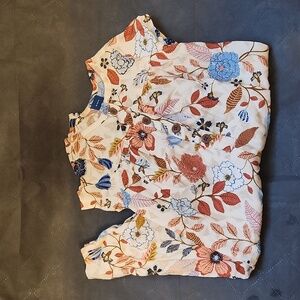 Charming baby romper with a vibrant floral design. Features shades of blue, orange, red, and cream. size 6-12 months. Has snaps down both legs and brown buttons around the chest. Very cute! Thanks for looking! God Bless!