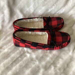 Old Navy NWOT Moccasin Slippers Women Medium 7-8 Sherpa Lined Buffalo Check Red