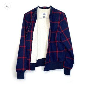 A stylish Old Navy bomber jacket in blue red windowpane plaid. This medium size jacket is a wool blend, features a zip-up design, pockets, and is lined with soft faux Sherpa for extra warmth and comfort.