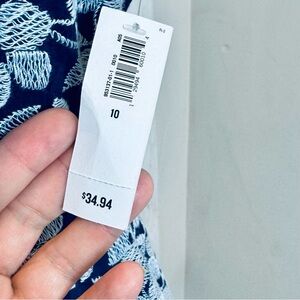 This charming Old Navy dress features a navy background with an all-over white embroidered floral pattern, perfect for warm-weather outings. Crafted from a breathable 100% cotton, it offers a comfortable, lightweight feel. The dress has a flattering boat neckline, cap sleeves, and a subtle A-line silhouette for easy movement. Lined. New with tags, original price $34.94.