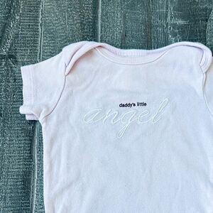 Old Navy “Daddy’s Little Angel” embroidered baby girl light pastel pink short sleeve onesie in excellent preowned condition. No stains or flaws, minor overall wear. Size 0-3 months. Clean nonsmoking home.