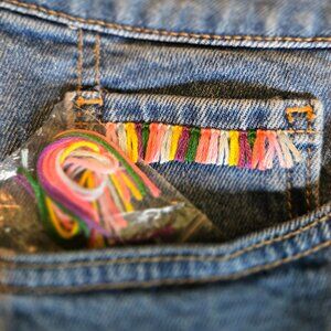 High waist |Zip front with button closure| Belt loops| Front scoop pockets and 2 back pockets |Size 16 | 99% Cotton / 1% Spandex | Unique front watch and back pocket designs (extra yarn for repairs provided)