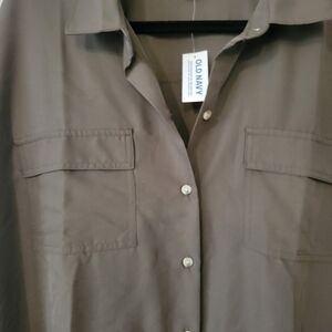 This stylish Old Navy olive green midi dress features a button-down front and a flattering tie waist. Perfect for any occasion, it offers both comfort and elegance.