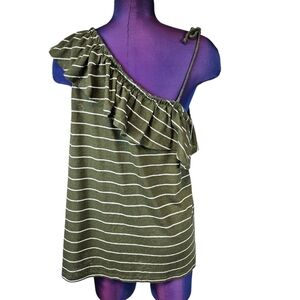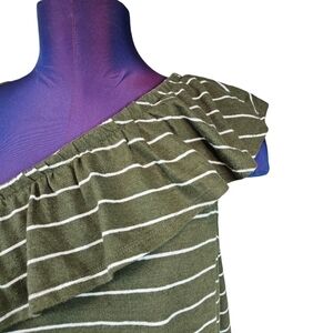In excellent condition Old Navy Olive White Striped Linen Blend Ruffle One Shoulder Top Size Large Q79
