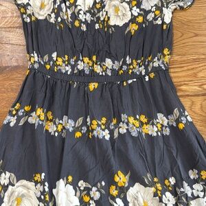Good used condition No liner Hits above knee Can be worn normally on shoulders or off shoulder Thin and lightweight material