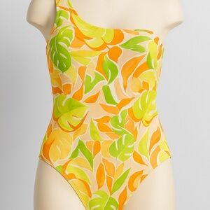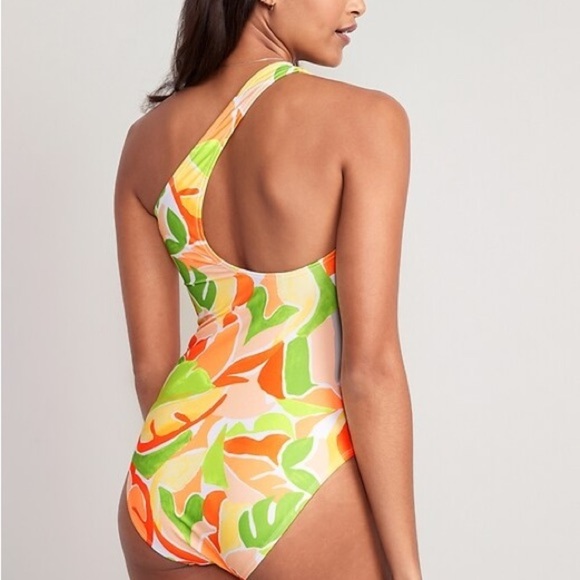 Bright and bold, this one-piece swimsuit from Old Navy features a vibrant tropical leaf print in shades of orange, yellow, and green. The stylish one-shoulder design adds a modern touch, while the soft, stretchy fabric ensures a comfortable and flattering fit.