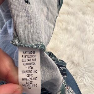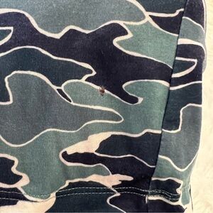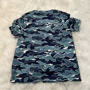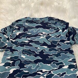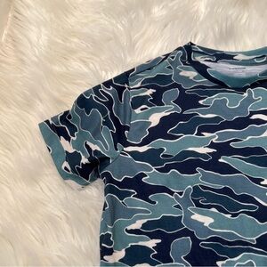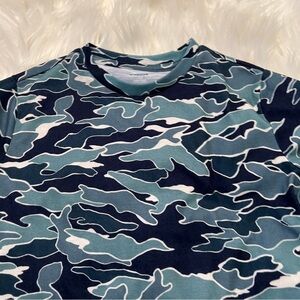 Good condition, has small hole near hem (pictured). Old Navy. Boys Pajama top. T-shirt. Short sleeve. Crewneck. Blue, green, black camo pattern, name is blue wave camo. Size Medium 8. 100% polyester. Measurements available upon request. Smoke free home. No trades, offers welcome.