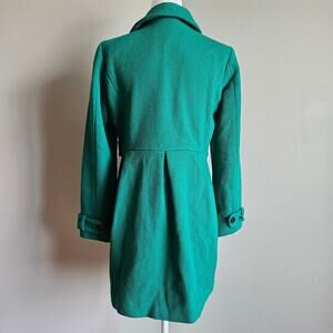 Notes: Vibrant emerald green wool blend peacoat with magenta lining. Double-breasted button closure, belted waist detail, cuff accents, and back pleat. Warm and structured with a tailored fit.