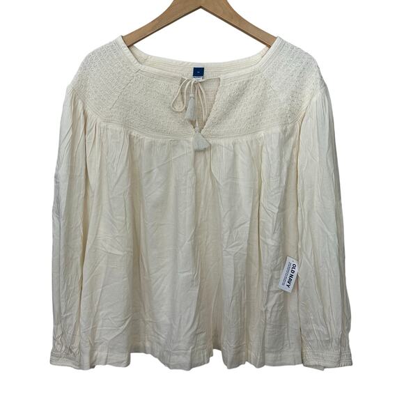 Old Navy Peasant Boho Top Womens 2X Cream Long Sleeve Smocked Tassels Popover