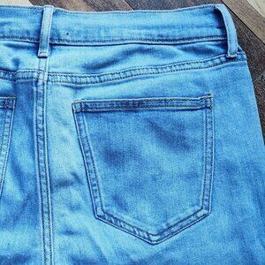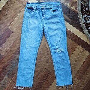 Old Navy Perfectly Straight Mid-Rise Jeans Size 6. Shredded hems. Ripped left knee. Excellent condition.