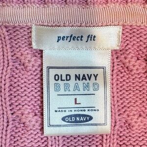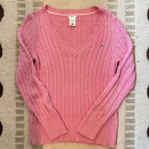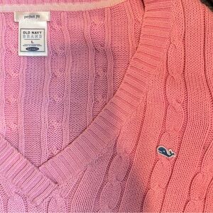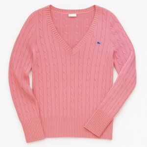 Classic pink cable knit V-neck sweater with embroidered whale logo on chest. Ribbed cuffs and hem add structure and stretch. Timeless preppy style perfect for layering or stand-alone wear.