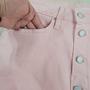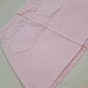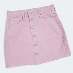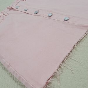 Light pink denim skirt with a button-front design. Raw edge cut off frayed hems. 5 pocket design.