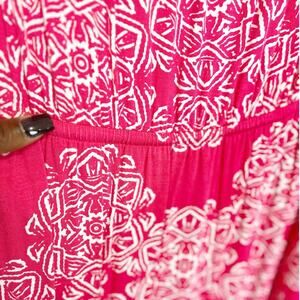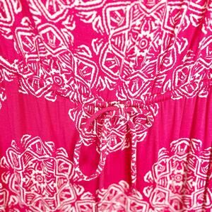 Old Navy Pink Geometric Floral Knit Strapless Drawstring Tube Midi Dress Size XL. This pink geometric floral knit midi dress features a strapless design with a cinched drawstring waist for a relaxed yet flattering fit. Its breezy style and versatile midi length make it perfect for casual summer outings, beach vacations, or a laid-back outdoor gathering. Tube / Blouson silhouette.