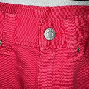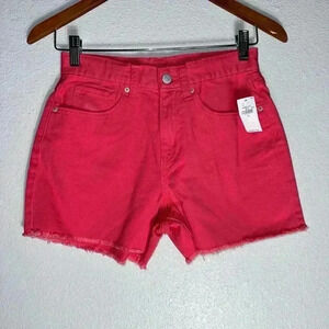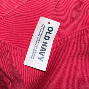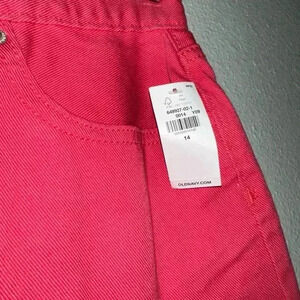 These are new with tags and in the box Old Navy high-rise, built-in tough denim shorts. They are a bright pink color and have a frayed hem. The shorts have a button and zipper closure, five pockets, and a belt loop waistband. The size is 14. The shorts are made of 100% cotton and are machine washable. The shorts are in excellent condition and have no visible imperfections.