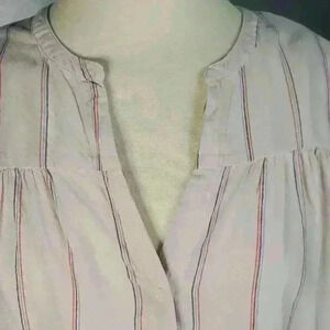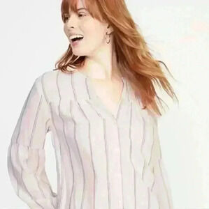 Pale baby pink color with beachy striped in red, blue, and navy. Notched V-neck collar, button up front, and long balloon sleeves. Size Large.