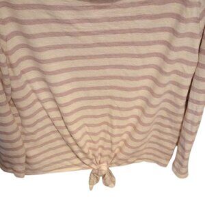Chic blouse with pink and white stripes. Features a stylish tie-front detail. Ideal for casual wear.