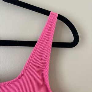 Stylish one-piece swimsuit. Vibrant pink color. Perfect for beach or pool. Size medium but runs large, I’m usually a medium and this was too big for me.