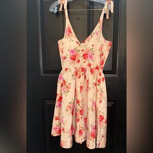 Elegant floral dress with pink and cream hues. Sleeveless design. Ideal for special occasions.