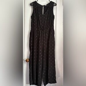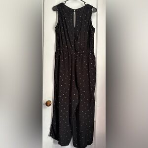 Stylish black jumpsuit with white polka dots. Sleeveless design with a V-neckline, elasticized waistband, side pockets, back secure with button, opening in back