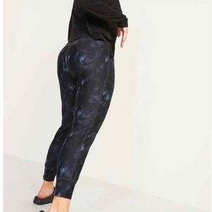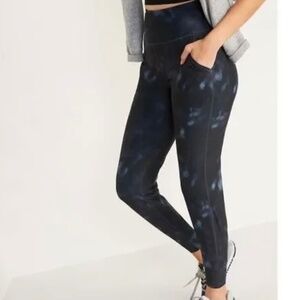 Old Navy Active Powersoft High Rise Jogger. Go Dry. Blue Tie Dye--basically, Black, Blue & a little Purple.I have so many pairs of these. They may have been worn once or twice but no sign they've been worn. Such great workout pants. Incredibly comfortable & versatile. The stock photos & close ups are the most accurate on color. 77% polyester, 23% spandex. Size Medium. High-Rise High-Waisted PowerSoft 7/8-Length Joggers Pants for Women: Power up your workout with PowerSoft joggers. Light compression fabric meets a ridiculously smooth, peachy-soft feel. --Elasticized high-rise waistband, with light-reflecting Old Navy Active logo at center back. --Diagonal on-seam hip pockets. --Banded cuffs. --Soft, breathable lightweight interlock fabric lets you vent. --Four-way super stretch for ultimate movement. --Go-Dry moisture-wicking technology keeps you dry & comfortable. --Flat-lock seams prevent chafing. --Gusseted for ease of movement. --High-waisted jogger pants sit high on waist. --Fitted through hip and thigh. --Tapered 7/8-length leg. --Women's jogger pants hit just above ankle. --Regular inseam: 26 1/2".
