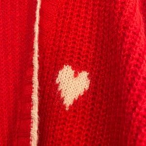 Bright red cardigan with a white heart accent. Open front design. Soft and stylish.