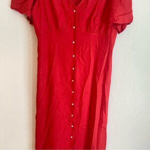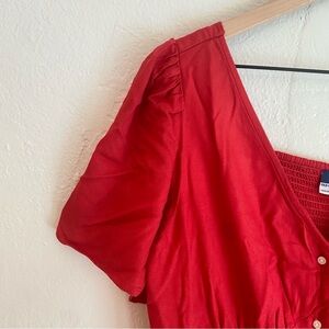This vibrant red sundress from Old Navy features a charming square neckline and playful puff sleeves, perfect for casual outings. Its buttoned design and midi length provide a stylish and breezy fit, ideal for warm weather adventures.