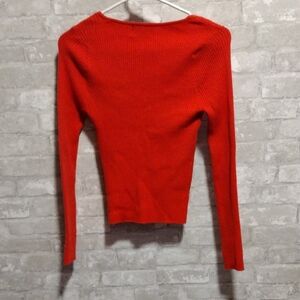 Stylish red ribbed sweater with a square neckline. Perfect for any occasion.