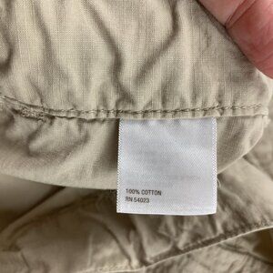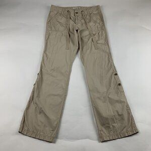 Excellent used condition, 100% cotton lightweight poplin chino pants have no notable signs of natural wear or overuse. 4 pockets, zip front, belt loops, low rise, front drawstring ties, adjustable roll cuffs with hidden button tabs. Size 8 Regular, please reference measurements for sizing & fit inquiries.