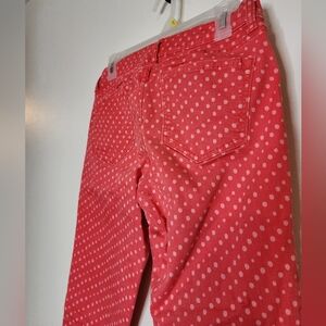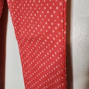 Chic red skinny jeans with playful polka dots. Ideal for casual outings.