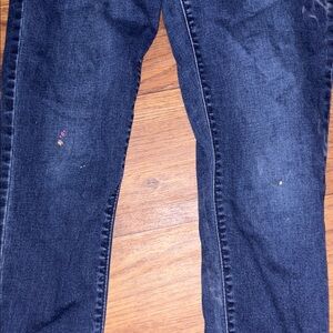 Rockstar jegging pull on legging pant jean style. The pockets are fake on the front, but the back pockets are functional. It has no belt loops, no buttons no zippers. They are straight pull on pants. There are a few paint splatters on the kneecap as shown in the photos. And has a distressed bottom hem.