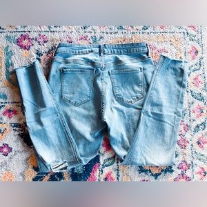 Old Navy rockstar super skinny ankle jeans. Ripped hem at ankles and distressing on one knee. Classic 5 pocket style, soft and stretchy material, button and fly closure.