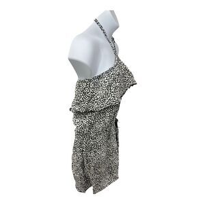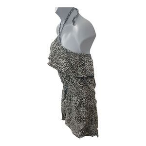 This Old Navy romper is a stylish and versatile jumpsuit in a size L, made from a linen blend fabric in a white color with black accents. The strapless design and drawstring waist give it a boho chic look, perfect for various occasions such as travel, parties, or casual outings. It features a sleeveless style, straight leg fit, and convenient pockets, making it a comfortable and fashionable choice for the summer, fall, or spring seasons. The animal print pattern adds a trendy touch to this one-piece romper from Old Navy.