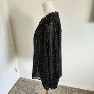 The Old Navy Ruffle Neck Blouse in XL is a stylish and versatile top for women. The black color with silver sparkly dot accents and sheer chiffon fabric adds a touch of glamour to the polka dot pattern and V-neckline design. This pullover blouse is perfect for various occasions including travel, parties, and casual outings. With a classic fit and long casual sleeves with rouched cuffs , this lightweight and breathable top is suitable for all seasons, making it a must-have in any wardrobe. Made by Old Navy, this blouse combines a bohemian and classic style with a hint of metal and gothic themes.